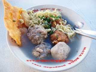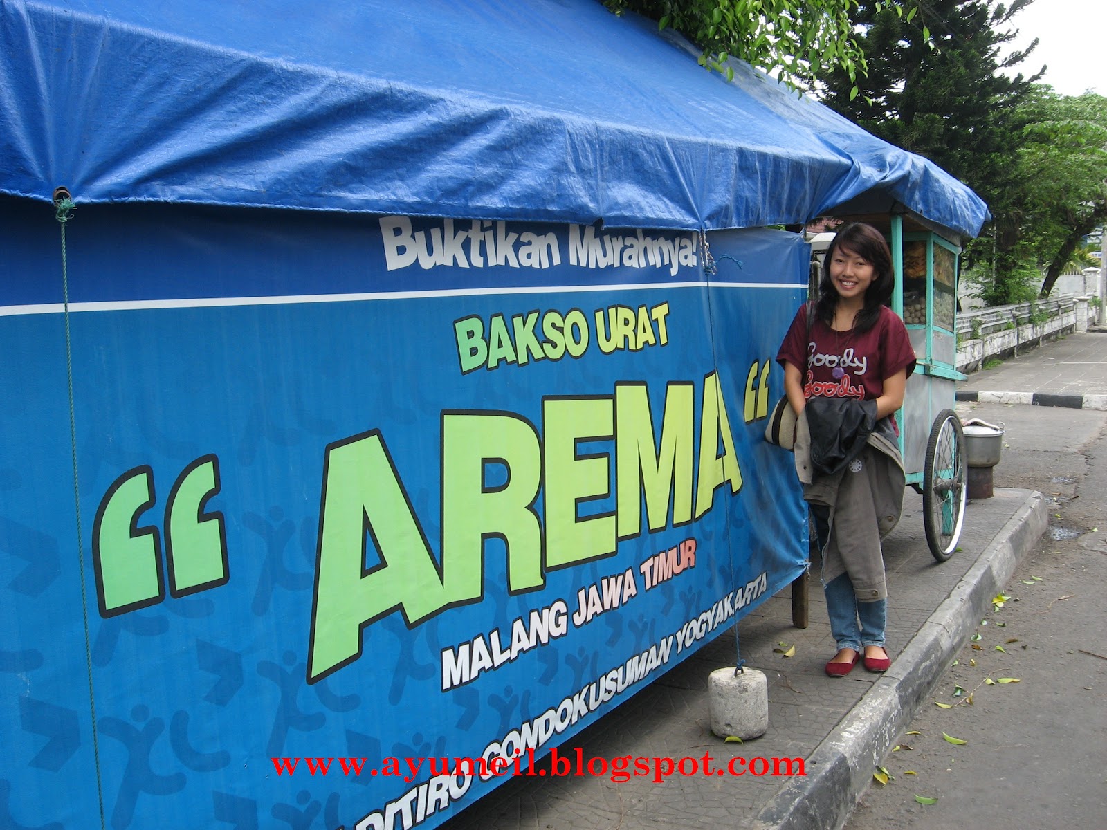 Ahaaa..!! Akhirnya Miss Ayu menemukan kuliner bakso terbaru, yaitu Bakso Arema. Makanan di pinggir jalan ternyata tidak selalu identik dengan makanan yang alakadarnya. Bakso Arema t'lah membuktikan kalo cita rasanya gak kalah dibandingkan dengan bakso yang ada di ruangan tertutup (alias indoor). Harganya yang pas bikin ketagihan dan lagi dan lagi, hehehe... Langsung ajah Miss Ayu dan Euis pesen bakso arema komplit plus es jeruk. Gak nyampe 5 menit, akhirnya bakso aremapun t'lah datang... taadaaaaaaaaaa!!
