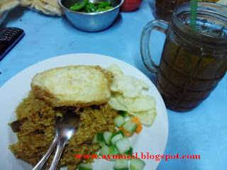 Begitu nyampe, Miss Ayu, Ujang, dan Udin langsung memesan nasi goreng sapi plus minumnya es teh manis. Abis itu kita bertiga ambil posisi duduk lesehan di atas trotoar yang beralaskan tikar. Ini bukan semata-mata karena gak kebagian tempat duduk juga lho, tapi lebih dikarenakan pen relaks ajah slonjoran kaki. Uupsss... slonjoran sih bahasa apa miss??? hihihi... Slonjoran itu pokoknya posisi kaki rileks. bisa melurus atau melekukkan kaki kita, hahahaha.... (*baca : gak tau sumbernya dari mana tuh kata "slonjoran" wkwkwk...). Gak nyampe 10 menit, nasi gorengnya udah dianter ajah nih ke tempat kita.