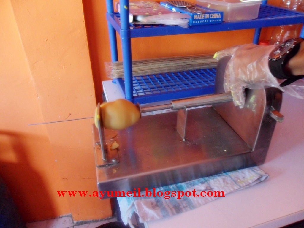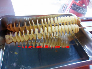 1. Kentang yang sudah dibersihkan dipotong dulu memakai alat khusus biar bentuknya menyerupai twister