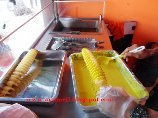 Menu yang ada di Mister Potato ini cuma ada 2 pilihan yaitu Twisterpotato Bumbu atau Spesial Twistpotato. Bahan, pilihan rasa, serta bentuknya sama kok, hanya yang membedakan kalo Twisterpotato Bumbu itu gak pake serutan keju tapi kalo Spesial Twistpotato itu pake serutan keju. Akhirnya kita berdua memilih 2 pilihan yang berbeda *biar bisa saling icip getooo wwkwk.... Variasi bumbunya pun sangad beragam diantaranya ada rasa Balado, Keju, Jagung Bakar, BBQ, dan Pedas Setan. Kita jogha bisa minta mix max lowh bumbunya biar nano-nano gitu rasanya hehe.. Nah, berhubung ketika Miss Ayu kesini masih dalam rangka harga promosi jadinya harga Twistpotato Bumbu cuma 5.000 rupiah dan Spesial Twistpotato cuma 6.000 rupiah sajah. Walah..walah.. sungguh beruntung sekaleeee :D