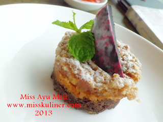 Ketika awal Miss Ayu mencoba Apple Crumble rasa khas kayu manis dan adonan apelnya kerasa bangetx. Tapi itu belom begitu mantep kalo hiasannya yaitu daun mint gak ikut dimakan jogha. Konon katanya hiasan apapun yang terdapat di atas sebuah cake, pancake, atau pastry sekalipun pasti itu disesuaikan dengan makanannya. Hal ini biar lebih menyempurnakan rasanya gitu. Ternyata BINGO!! Rasanya mamamia enakkk... Lebih kerasa pas karna ada aroma daun mintnya jogha ~(‾▿‾~)(~‾▿‾)~
