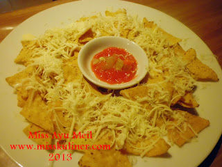 Hari gini siapa sihhh gak kenal Nachos? Makanan khas Meksiko yang berbentuk kripik Tortilla. Biasanya memang disajikan dengan keju cair dan saus salsa. Namun, disini penyajiannya berbeda. Soalnya nachos disini disajikan di atas piring hanya ditaburi keju parut dan mayonaise. Trus untuk sausnya, terbuat dari saus sambal dengan ditambah perasan keruk nipis, potongan tomat, dan irisan cabe rawit. Rasanya biasa ajah sih, soalnya mirip sama salah satu snack yang biasa Miss Ayu beli di swalayan hihihihi.. But, not bad lahh.. :)